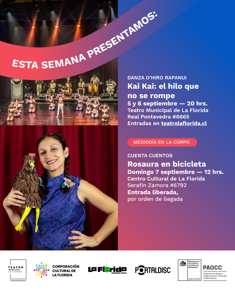 El mes de septiembre ya está aquí y en La Florida se viene cargado de panoramas. El primer fin de semana comenzará con “Kai Kai: El hilo que no se rompe” de Ohiro Rapa Nui, en el marco del Día de la Mujer Indígena. Ese mismo sábado, a las 17:30 horas, se presentará el Concierto de Música Chilena y Latinoamericana, dirigido por el barítono Alan Oporto. Además, el domingo será el turno de “Mediodía en la Corpo” con el cuentacuentos Rosaura en bicicleta.